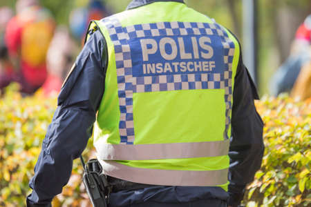 May 28, 2021, Belgium, Back of a Belgian policeman in Brussels. Police in French and Flemish