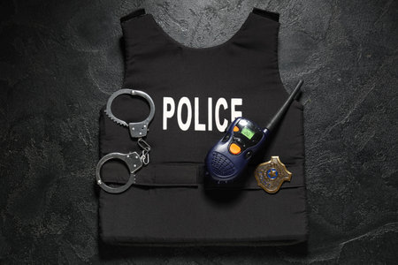 Police officer's bulletproof vest, weapon, walkie-talkie and handcuffs on dark background