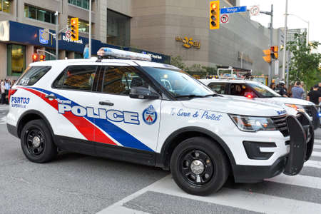 Toronto, ON, Canada - JUNE 21, 2019: Police car during the demonstration of the street of Toronto at Trans March and Pride Month.