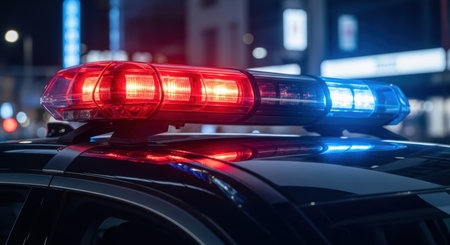 Close up of a police car flashing red and blue emergency light bar at night, with blurred city lights in the background. Represents law enforcement, emergency services, and urban safety.