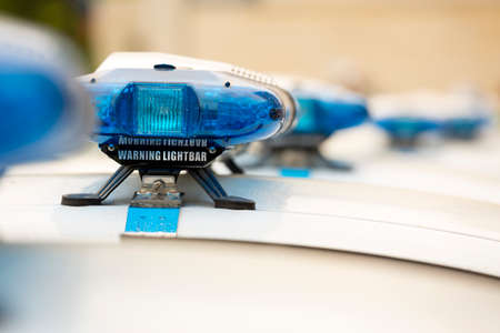 Blue warning lightbars on new patrol police cars. Close-up.