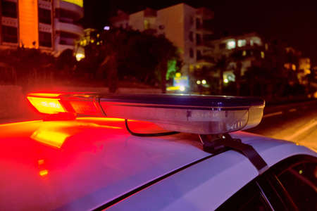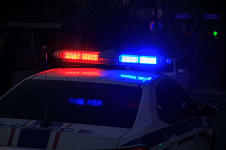 police car flashing lights in the night selective focus.