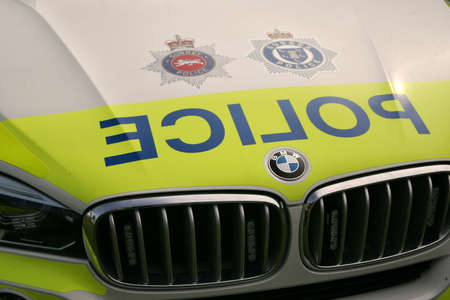 Guildford, England - May 28 2018: Close up of the front grille and bage of a BMW car beloning to Surrey and Sussex Police with the word POLICE reversed