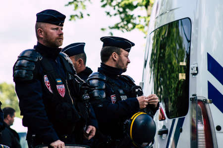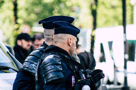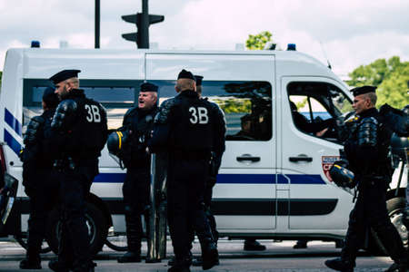 Paris France May 11, 2019 Portrait of a riot squad of the French National Police in intervention during protests of the Yellow Jackets against the policy of President Macron in Paris on saturday afternoon
