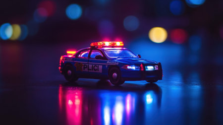 A miniature toy police car with flashing lights on a dark surface, adding drama to a child's play theme