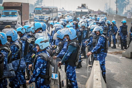 Police officer team with weapons and riot shield protection. Violence Against Demonstrators and protesters during COVID-19 pandemic. Riot in Bangkok, Thailand. Demonstration people. Cop authority.