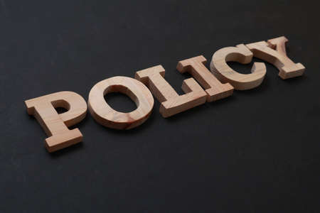 Policy, text words typography written with wooden letter on black background, life and business motivational inspirational concept