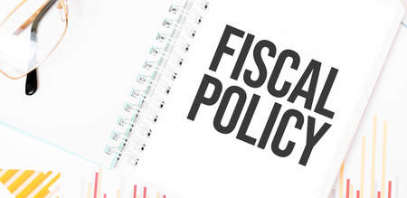 Text fiscal policy on white notepad, glasses, graphs and diagrams.