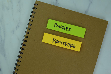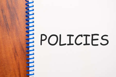 Text policies written in notepad, Office wood table from above, concept image for blog title or header image. Aged vintage color look.