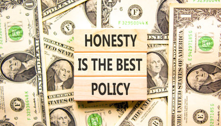 Honesty is the best political symbol. Concept words Honesty is the best policy on beautiful wooden blocks. Beautiful dollar bills background. Business honesty is the best policy concept. Copy space.