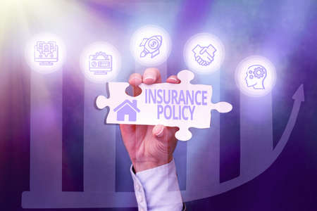Sign displaying Insurance Policy. Concept meaning document detailing the terms and conditions of a insurance Hand Holding Jigsaw Puzzle Piece Unlocking New Futuristic Technologies.