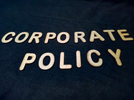 Corporate policy word presented on black board with wooden text art texture at educational style.