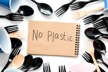 No plastic copy. Planet protection. Eco concept and injunction on the use of plastic flatware on white background top view.