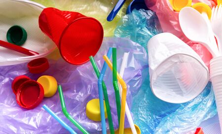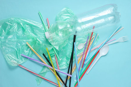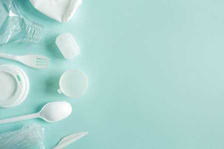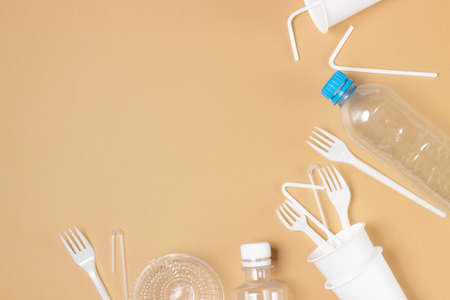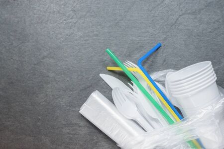 The concept of pollution plastic and polyethylene environment. Cellophane bag, plastic bottle, disposable forks and spoons, cocktail tubes on background. Top view