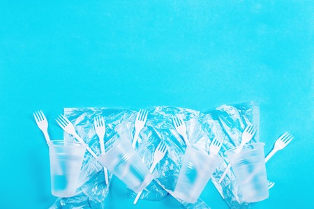 Top view of crushed plastic spoons, forks and cups as a disposable waste with copy space on bright blue background. Environmental pollution and litter recycling concept.