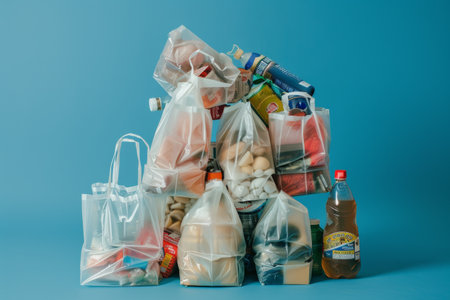 various types of plastic packaging on a blue background, a bag of tomatoes, bananas wrapped in a film and a bottle of milk, disposable tableware, sauce and honey in a snack container