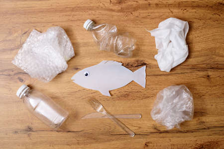 fish and water pollution by plastic waste, garbage concept