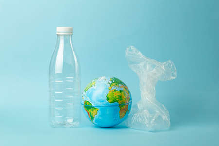 A globe in a plastic bag over a plastic bottle on a blue background. Concept: plastic garbage turns the planet into a waste dump. Copy space. Selective focus.