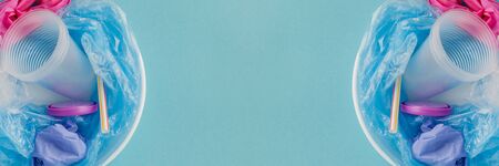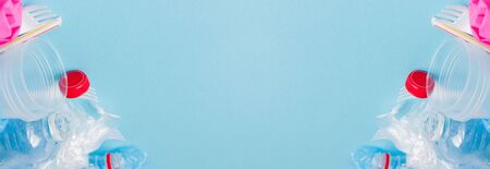 Top view of various kinds of disposable plastic waste on blue background, copy space.