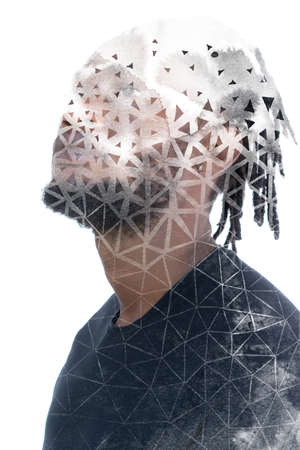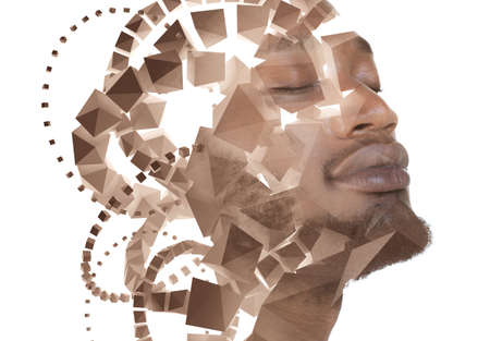A portrait of a man combined with 3D polyhedra in a double exposure technique.