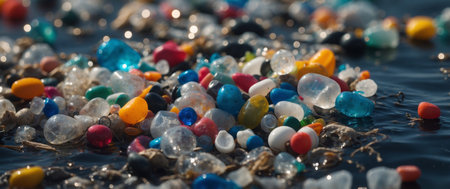 Close-up of microplastic particles background. Environmental water pollution problem of rubbish and trash in the oceans and seas
