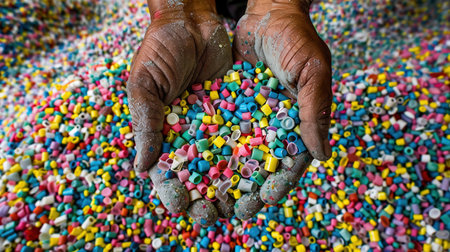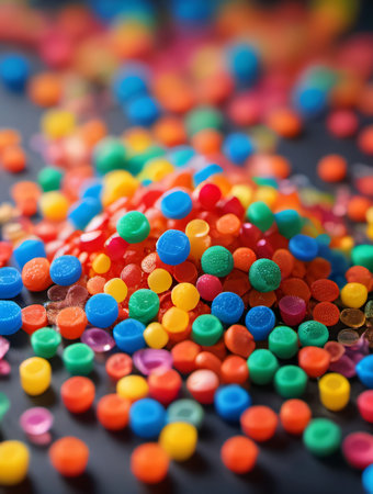 Multi-colored biodegradable plastic granules on table highlight recycling concept