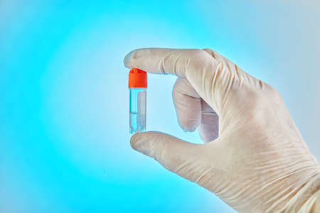 transport vial for laboratory, with sticker personal data in the hands of doctor, with blue background