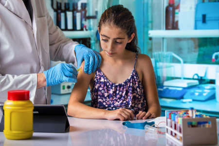 pediatrician doctor injecting a young adult kid girl a vaccine in the medical office / pediatrician physician vaccinating a little girl in the healthcare pediatric clinic