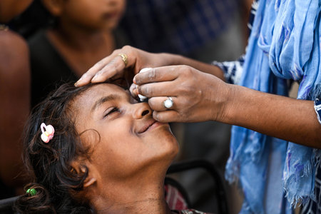 NEW DELHI, INDIA - JULY 24: An NGO volunteers seen putting eye drops in the eyes of the people who are affected with eye flu at Relief camp in the Mayur Vihar area amid rise in the water levels of Yamuna River, on July 24, 2023 in New Delhi, India. (Photo