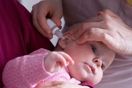 mother dribble medication in baby ear. Ear drops