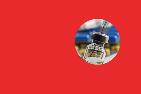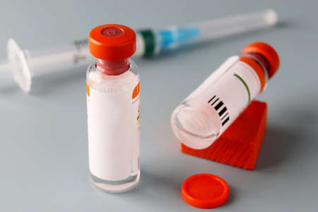 Covid-19 Corona Virus 2019-ncov vaccine vials medicine drug bottles. Vaccination, immunization, treatment to cure Covid 19 Corona Virus infection. Healthcare And Medical concept.