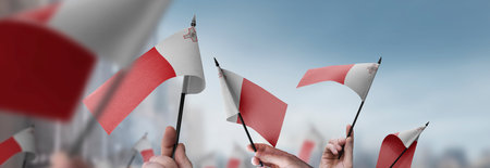 Polish red and white flags in old town in front of building on Sunny day. red brick wall on background. 1 of May, November 11, flag or independence or labor day. Government holiday in poland.