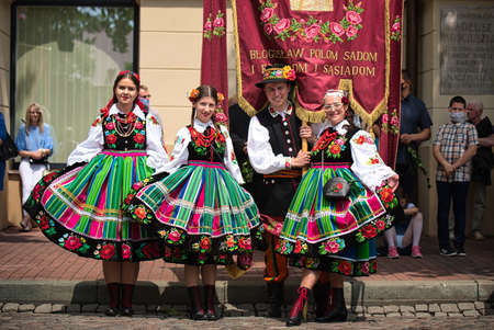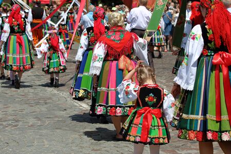 Lowicz, Jun 11, 2020: People dressed in polish national folk costume from Lowicz region during Corpus Christi procession. Polish typical folk dress