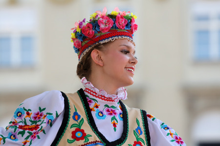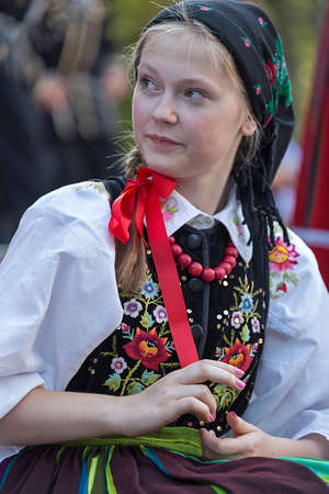 ROMANIA, TIMISOARA - JULY 7, 2016: Young girl from Poland in traditional costume, present at the international folk festival, International Festival of hearts organized by the City Hall Timisoara.