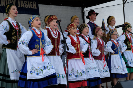 GDANSK, POLAND - SEPTEMBER 15, 2019: Outdoor event Kashubian Festival 735 years of Jasien. Song and dance ensemble in Kashubian costumes on the stage.