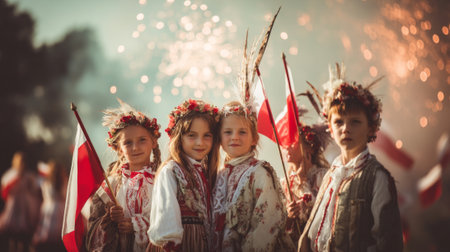 a group of children, dressed in traditional clothing, hold flags as they celebrate with fireworks around them