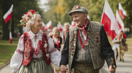 an elderly couple dressed in traditional clothing holds hands during a parade with waving flags around them