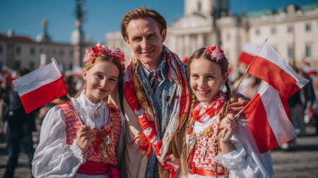 a man and two girls holding flags in a city square with a building in the background on a sunny day