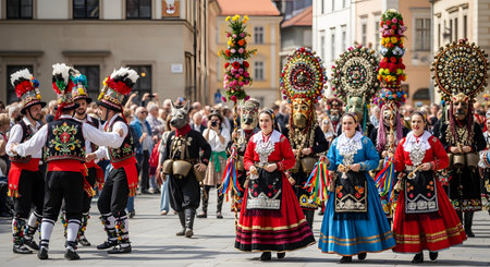 Performers in vibrant and elaborate traditional folk costumes participate in a parade during the Busojaras spring festival in Mohacs, Hungary. The men and women are dressed in richly embroidered attire with towering, colorful floral headdresses, celebrating a centuries-old cultural tradition. The festive procession moves through a European town square filled with spectators.