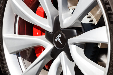Close-up of aluminum rim of a new Tesla Motors car parked in city