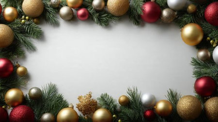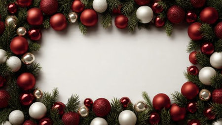 Border-style Christmas composition with ornaments guiding focus toward the empty center space.