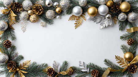 A calm white center bordered by pine greenery and sparkling gold-and-silver ornament clusters.
