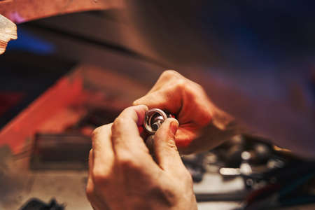 Cropped photo of an experienced craftsman treating a keychain with a graver under a lamp