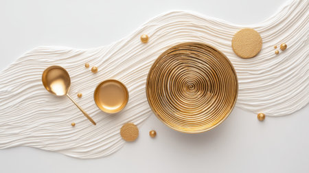 A visually stunning arrangement featuring golden tableware and decorative elements on a smooth white surface, embodying elegance and modern design for any aesthetic.