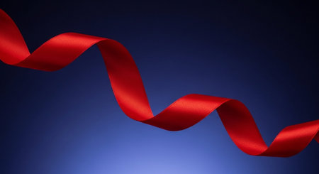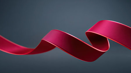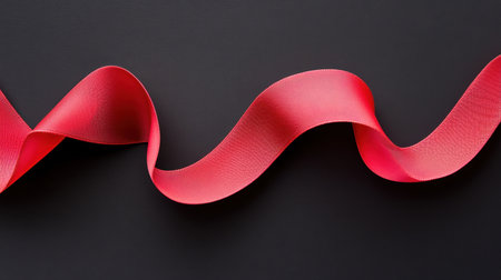 A striking red ribbon gracefully twists and curves against a soft dark background, showcasing elegance and beauty. Ideal for design projects or festive celebrations.