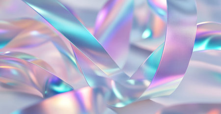 A close-up of an abstract, futuristic background with swirling metallic ribbons and holographic colors, creating a sense of depth and motion on the white backdrop. The ribbon-like shapes have reflective surfaces that reflect light in vibrant hues like blue or purple, adding to their fluidity and elegance. This design is perfect for conveying innovation and modern aesthetics in digital marketing materials. --ar 29:15 --v 6.1 Job ID: 2f383ea7-0a25-4cc6-8d9a-bd7bcdd78582