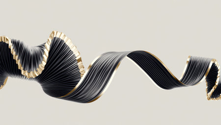 An abstract illustration presents a flowing ribbon with a dark body and gold trim. The design features undulating curves and a three-dimensional appearance. Set against a plain backdrop, the image showcases a modern style, suitable for various design applications, potentially for use in advertising or decorative projects.