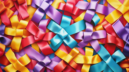 Bright ribbons and bows in various colors intersect to create a lively and festive pattern, ideal for decorations or celebrations.