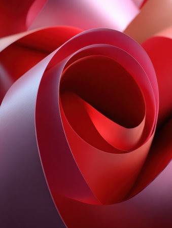 Colorful layers of red paper are intricately curled and layered, forming an elegant and vibrant abstract display that catches the eye