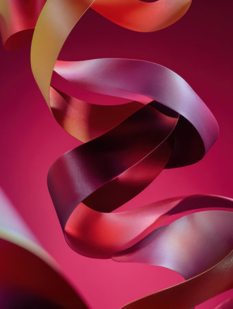 Ribbons in shades of red and yellow twirl elegantly in mid-air, creating a visually striking composition with a vivid pink backdrop.